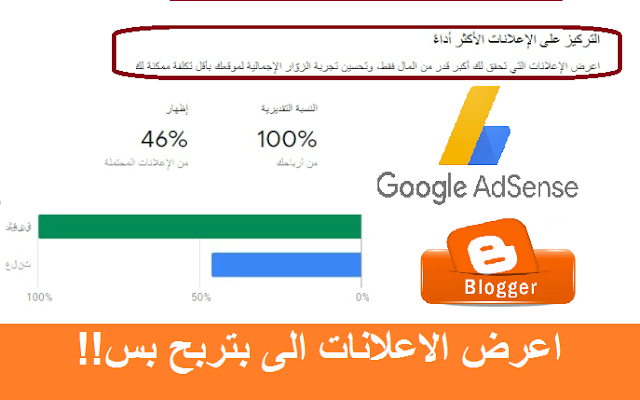 لكن تأكد من ان خانة الارباح تظل بنسبة 100% حتى لا تفقد سنت من ارباحك وهذه الخاصية كما ذكرنا تحدد فقط الاعلانات ذات الارباح العالية ولا تقلق لم تضر بمدونتك او معدل ظهور الاعلانات فقط حتى لا تعرض اعلانات لم تدفع بمعنى اخر ان يتم حجز وحدة اعلانية ببلاش والجميع يريد ان يربح من ادسنس لكنن عليك تفقد الامر يوميا لمعرفة معدل توازن الاعلانات يوميا